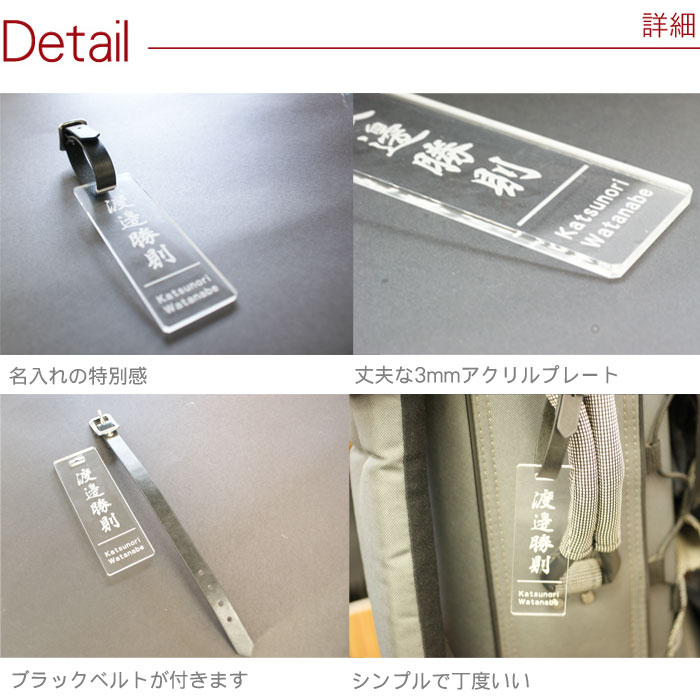 ゴルフネームタグとして、敬老の日、父の日、 還暦祝いやゴルフコンペの景品やプレゼントに、 ネームプレートとして、友達、彼氏、彼女へのギフトに最適! 名入れで世界に一つのプレゼントを! 仕様 / サイズ ■プレート材質:アクリル樹脂 ■プレートサイズ:10cm×3.5cm×3mm ■革ベルト材質:合皮(ブラック) ■ベルトサイズ:21cm×1.1cm×2mm 配送方法 宅配便/メール便 彫刻内容 ●文字数 ■縦:6文字程度(日本語/行書体) ■横:17文字程度(ローマ字/丸ゴシック) ※お名前は、【漢字】・【ローマ字】それぞれご指示ください ※彫刻内容は買い物かご→購入手続き→【備考欄】へ当店をよくご利用いただくシーン 長寿祝い 還暦 (かんれき) 60歳 / 古希 (こき) 70歳 / 喜寿 (きじゅ) 77歳 傘寿 (さんじゅ) 80歳 / 米寿 (べいじゅ) 88歳 / 卒寿 (そつじゅ) 90歳 白寿 (はくじゅ) 99歳 / 百寿 (ももじゅ) 100歳 / 茶寿 (ちゃじゅ) 108歳 皇寿 (こうじゅ) 111歳 / 大還暦 (だいかんれき) 120歳 結婚記念日 紙婚式 1周年 / 藁婚式 綿婚式 2周年 / 革婚式 3周年 / 花婚式 4周年 木婚式 5周年 / 鉄婚式 6周年 / 銅婚式 7周年 / ゴム婚式 8周年 / 陶器婚式 9周年 錫婚式 アルミ婚式 10周年 / 鋼鉄婚式 11周年 絹婚式 亜麻婚式 12周年 / レース婚式 13周年 / 象牙婚式 14周年 水晶婚式 15周年 / 磁器婚式 20周年 / 銀婚式 25周年 / 真珠婚式 30周年 珊瑚婚式 翡翠婚式 35周年 / ルビ−婚式 40周年 / サファイア婚式 45周年 金婚式 50周年 / エメラルド婚式 55周年 / ダイヤモンド婚式 60周年 プラチナ婚式 75周年 お祝いごと プレゼント / Present / ギフト / Gift / 贈り物 / 贈りもの / 贈物 / 贈呈品 / 贈呈 贈答品 / 贈答 / ラッピング / ギフトセット / セット / 誕生日 / 誕生日プレゼント 出産祝い / 出産内祝い / 内祝い / 結婚 / 結婚式 / 結婚祝い / 結婚内祝い / 結婚記念 引き出物 / 引出物 / 開店祝い / 開店 / 周年記念 / 周年祝い / 地鎮祭 / 成人 成人祝い / 成人式 / 新成人 / 卒業 / 卒業祝い / 入学祝い / 就職祝い / 新入社員 新生活 / 新生活応援 / 初任給 / 記念日 / 記念品 / 昇進 / 転勤 / 送別 / 退官 / 定年 退職 / 送別品 / 勤続 / 永年勤続 / 勤続記念 / 永年表彰 / 祝い 季節のイベント お正月 / 新年会 / バレンタイン / バレンタインデー / バレンタインデイ / Valentine ホワイトデー / ホワイトデイ / whiteday / 母の日 / Mother's Day / 父の日 Father's Day / こどもの日 / 子供の日 / 子どもの日 / 端午の節句 / お中元 / 敬老の日 敬老 / 勤労感謝 / クリスマス / Xmas / Christmas / Chrismas / くりすます 忘年会 / お歳暮 / 増税 / 令和 / 令和元年 / 2019 / 2020 プレゼントのお相手 男性 / メンズ / Men's / めんず / 女性 / レディース / れでぃーす / レディス レデイース / Ladies / 父 / お父さん / おとうさん / 義父 / お義父さん / 義理の父 義理父 / 義理 / パパ / Papa / 母 / お母さん / 母さん / おかあさん / ママ / まま お義母さん / 義理の母 / 義理母 / 義母 / Mama / 子供 / 子ども / こども / キッズ Kids / 男の子 / 女の子 / おじいちゃん / じい / お爺ちゃん / お祖父ちゃん / 祖父 おばあちゃん / ばあ / ちゃん / お婆ちゃん / お祖母ちゃん / 祖母 / 妻 / 夫 / 彼氏 彼女 / 友達 / 上司 / 部下 / 先輩 / 後輩 / 孫 / まご / マゴ / 夫婦 / めおと / 両親 カップル / 10代 / 20代 / 30代 / 40代 / 50代 / 60代 / 70代 / 80代 名入れ表記について お客様ごとに、 名入れ / 名いれ / ないれ / 名前 / 名前入 / 名前入り / 名前入れ / 彫刻 / 刻印 / 文字入れ / ネーム入れ といったように表現が異なりますが、当店では全てを総称して「 名入 れ 」と表記しております。